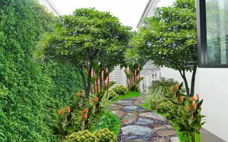 งานจัดสวนแบบผสมผสานแนวสวนหินและแนวสวนป่า ทางเท้าขนาดพื้นที่ประมาณ 28 ตรม.
